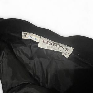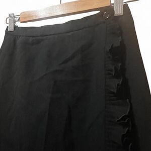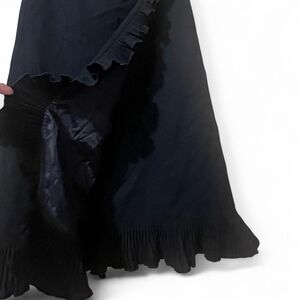 VintageBlack midi skirt with asymmetric wrap ruffle detail, side zipper closure. Cute button detail on hip. Unfortunately there is no composition tag, but I’m guessing a wool poly blend? Union made vintage size 6 (guessing a 0/2 at the moment). Measurements to come; please ask if not up yet(: