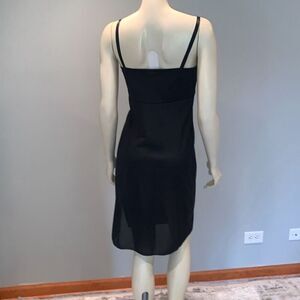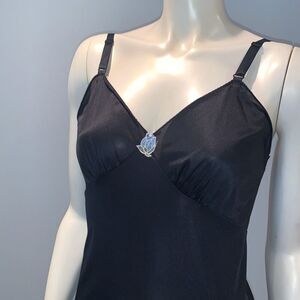 Vintage black lace slit dress. Adjustable straps. Sides slit. No lace trim. Sheer chiffon embroidered blue and green floral center adornment. Excellent vintage condition. No labels. Women’s size medium. Please see measurements below.