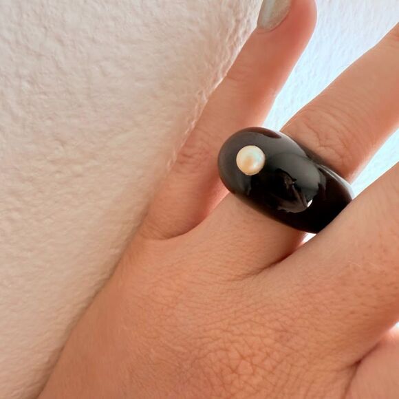 Vintage Black Onyx & Pearl Dome Cocktail Ring size 7.5