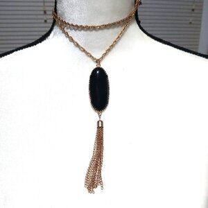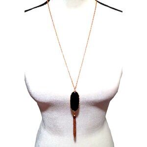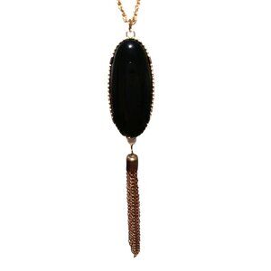 Vintage Black Oval Bead Necklace Tassel Pendant Antiqued Gold Tone 24" Chain