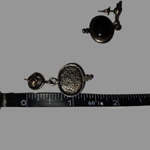 Stylish vintage-inspired silver tone dangle earrings featuring oval black cabochon centers. The earrings have a decorative stud top with a small circular design and textured back. Each earring measures approximately 1.5 inches long. Perfect for a boho, western, or retro look.