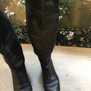 Vintage Black Over-the-Knee Patchwork Boots recently re-soled and leather refurbished. Patchwork mix of leather and Suede. Elastic below knee helps keep boots up while retaining baggy look. Best for narrow feet.