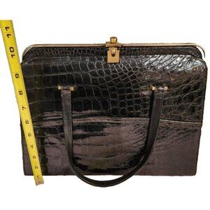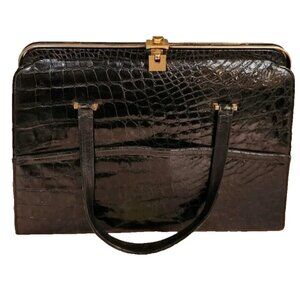 Vintage Black Patent Alligator Leather Handbag By Bellestone, Gold tone accents,