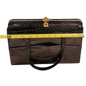 This Bellestone handbag carries a tale of timeless sophistication. Its glossy alligator pattern exudes vintage charm, while the leather lining whispers luxury. The sturdy clasp and elegant handles speak of an era when quality was paramount. A statement piece for those who appreciate the stories woven into classic accessories.