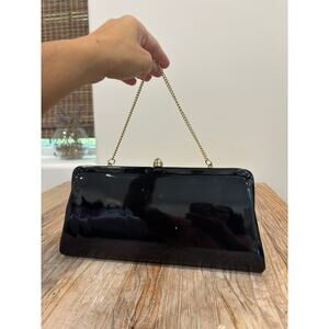 This vintage black patent leather clutch is a timeless statement piece, featuring a sleek glossy finish, a delicate gold chain handle, and a subtle bow accent on the front. Its structured frame and clasp closure add a touch of mid-century glamour — perfect for cocktail parties, weddings, or formal occasions. Can be carried as a clutch or worn with the chain for effortless elegance.