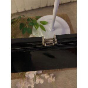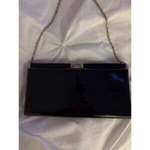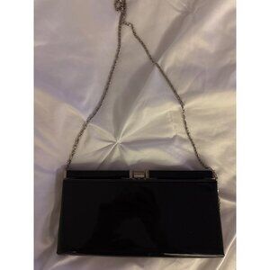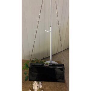 Vintage Black Patent Leather Clutch With Silver Chain Strap & Clasp Closure