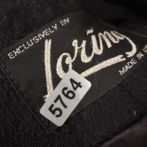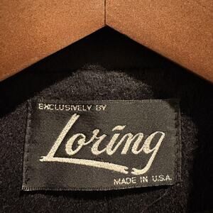 Features: Double-breasted button front, large notched lapels, two front pockets, fully lined interior, classic formal style. Brand tag reads "Exclusively by Loring Made in U.S.A." and "Andover Fabric by Forstmann."