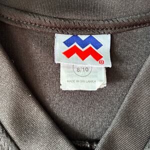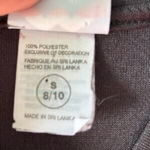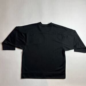 V-neck, embroidered emblem on the upper right chest, batwing sleeves. See photos for slight snags on the back left shoulder, and right above the emblem.