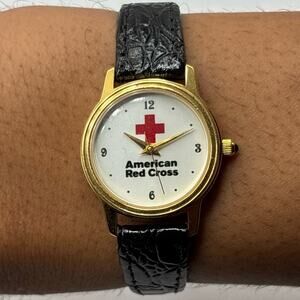 Vintage Black Red Cross Watch. Fully functional with brand new batteries. Adjustable leather band fits 6 1/2 in wrist or near.
