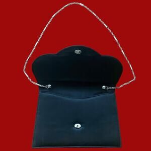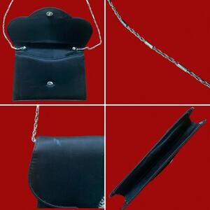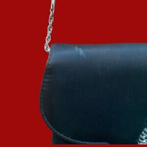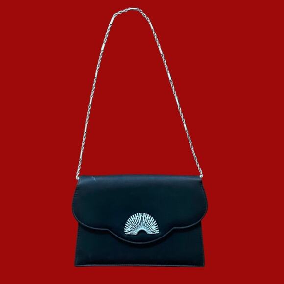Vintage Black Satin Evening Bag with Silver Fan Decal and Chain Shoulder Strap
