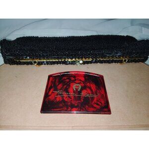 Vintage Black Sequin Clutch With Gold Chain & Mirror Made in British Hong Kong