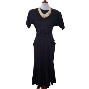 This Vintage dress features a sophisticated black sheath design, perfect for a cocktail night out. The dolman short sleeves and crew neck add a touch of elegance to its classic silhouette. Its midi length and fitted style create a timeless and chic look.