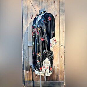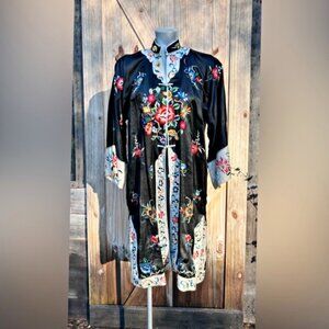 Vintage Black Silk Floral Embroidered Japanese Asian Boho Cardigan Kimono Robe Jacket has buttons up the front and is 22" armpit to armpit, 20" across the back shoulders and 38" long.