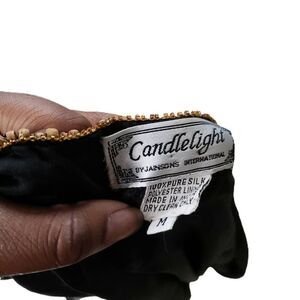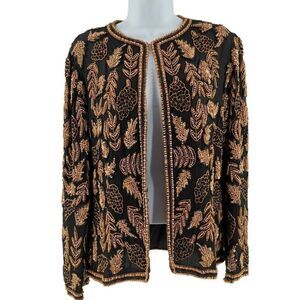 This elegant vintage black silk jacket by Candlelight BY JAINSONS International features intricate tan, gold, and black beading with tan wooden beads arranged in a leaf design. Made in India, this jacket is in very good vintage condition and is perfect for anyone who loves statement vintage fashion.