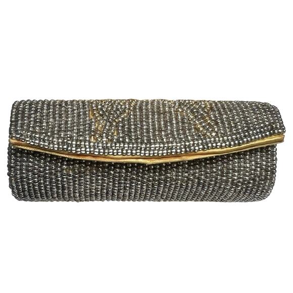 Vintage Black Silver Beaded Lipstick Case Butterfly Pattern Orange Satin Lined