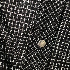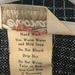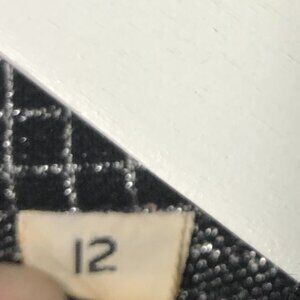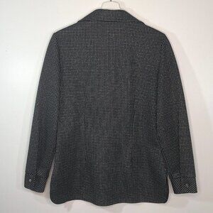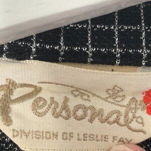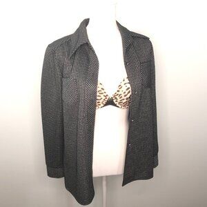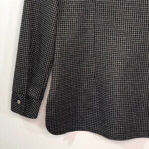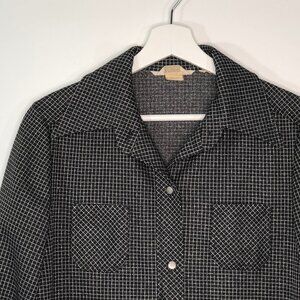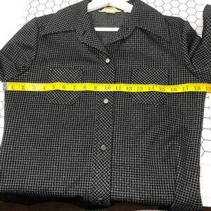 Vintage Black Shimmery Silver Windowpane Button up shirt with large collar in that late 60s/70s style. Double front pockets. This shirt works like a jacket--a shacket if you will. Great windowpane, check pattern. Personal a Leslie Fay Company. Includes the union label. Good vintage condition. Please see photos.