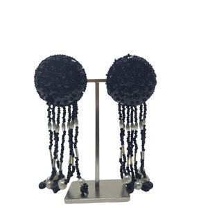 Step up your vintage jewelry game with these stunning 1980s-1990s clip-on earrings, featuring black and silver sequins and beaded fringe. These 3-inch statement earrings catch the light beautifully and offer comfort and style, making them perfect for any occasion.
