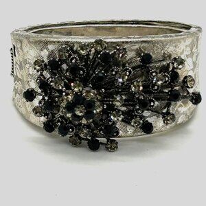 Vintage Black & Smokey Rhinestone Bracelet Hinged Etched Silver-Tone 6.5 Clamper