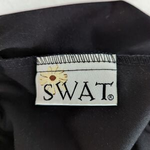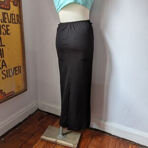 Vintage black maxi skirt with multicolor sparkles. Has a slit up the back. By Swat. No size or material tags- waist has elastic in the back and measures 24" unstretched. Hips are approx. 30" unstretched. 36" long. Material is a thicker synthetic with a bit of stretch. In great vintage condition.