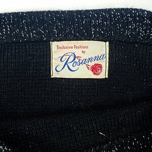Vintage 1980s or early 90s sparkly black sweater by Exclusive Fashions by Rosanna. 3/4 sleeve with cropped tasseled hem. Bateau neckline. In excellent vintage USED condition.