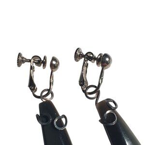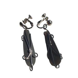 Vintage Black Stone Drop Clip Earrings Silver Tone Wire Wrap Screw Back Retro