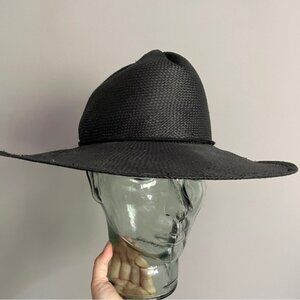 Vintage Black Straw Large Brimmed Hat w/ Pinched Crown