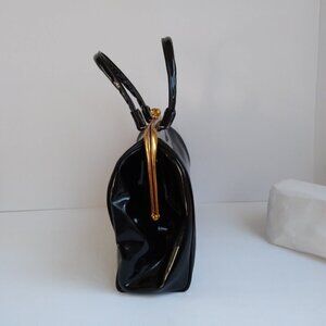 Vintage Black Sturdy Shiny Roomy Patent Gold Kiss Clasp Envelope Satchel Bag