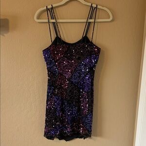 Stunning dress with Shades of purple and black sequins. Features a strappy design. Ideal for evening events.