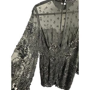 Sexy, yet classic late 80s Black Tie OLEG CASSINI black beaded mini dress ! Features thousands of hand-sewn seed beads throughout the front and back bodice. Soft rayon blend fabric. Hidden zipper up the back with hook-and-eye closure. Stunning sweetheart neckline with a sheer overlay on the decolletage and arms.