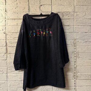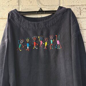 Vintage Black Tunic with Rainbow Stick Figure Folk Art Embroidery