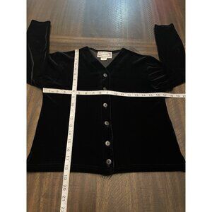 Timeless 1990s Carrie Allen two-piece velvet set in classic black. Includes a sleek scoop-neck maxi tank dress and a button-front cardigan—wear together for evening elegance or style each piece separately. The velvet has a soft hand and subtle sheen, perfect for quiet luxury and holiday events. Witcy Vampire.