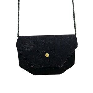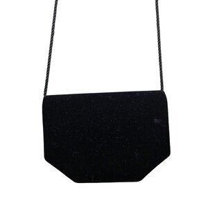 An elegant evening clutch in luxurious black velvet, offering a sophisticated touch with its gold button closure and sleek design. The rope strap adds a classic element, making it a versatile accessory for formal events.