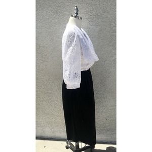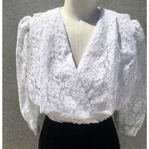 This stunning vintage dress is perfect for any special occasion. The black velvet and white lace combination gives it a classic and timeless look, while the elegant silhouette makes it ideal for evening wear. The brand is Champagne, a vintage 1980s label featuring collections known for their classic elegance. Its lacey and velvety fabric has retained their original beauty and feel. This is the perfect vintage option, sure to stand out and capture the best kind of attention among a sea of little black boring dresses!