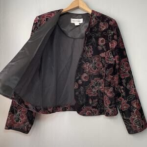 Norton McNaughton button front long sleeve black velvet with red and silver metallic floral jacket blazer in Excellent vintage condition!