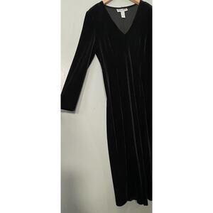 Jessica Howard long sleeve black velvet V-neck maxi dress with shoulder pads and front slit in Excellent vintage condition!