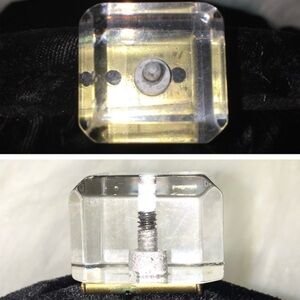 True Vintage 40's era small black velvet purse has a lucite(acrylic) cube clasp closure and is lined in taffeta. It is in ok vintage condition. there is some deterioration on the velvet and the lining due to its age a wear. On both sides the metal hardware is exposed and the frame is slightly uneven(see photo) You can't really tell while wearing.