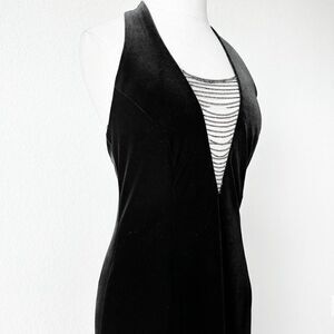 Y2K 2000s coquette fairy vintage velvet fishtail bodycon maxi dress featuring a plunging halter V-Neck and beaded details over a sheer mesh to cover the bust area. Zips up in the back. Unlined. Tagged as a Size 8. Pre-loved. Excellent. No visible stains or tears