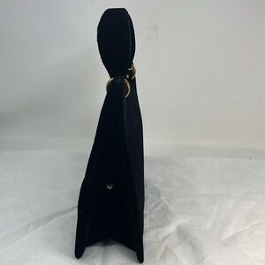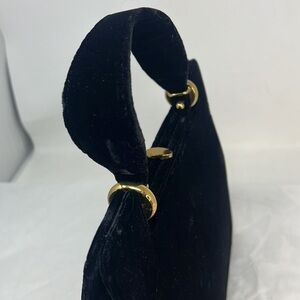This is a gorgeous Vintage Black Velvet Velour Structured Handbag. Super sold rich velvet. Goldtone hardware. Satin interior with change purse two slip in compartments and a zipper pocket. Very roomy. Clean. No odors. A couple of small scuffs on the font but hardly noticeable if at all. 10.75” x 10.75” x 3” with 5” handle drop.