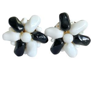 Vintage Black & White Beaded Clip On Earrings 60s 70s Acrylic Plastic