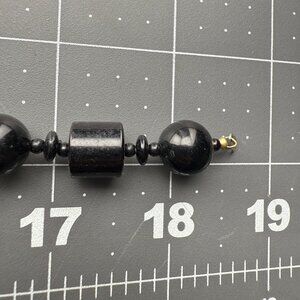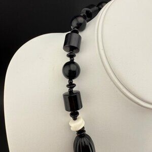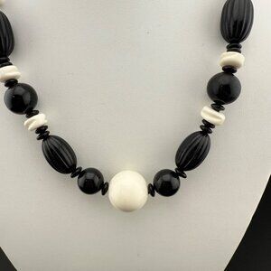 A bold vintage black and white beaded necklace featuring a chunky statement design. Contrasting beads of unique shapes are complemented by a gold-tone clasp for closure.