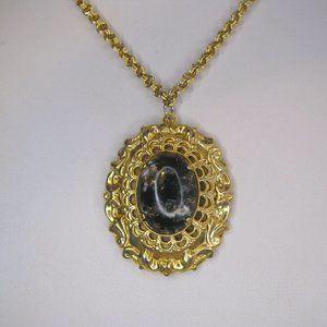 Vintage Black White Gold Faux Stone Pendant Necklace 21" L