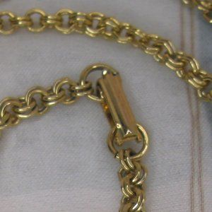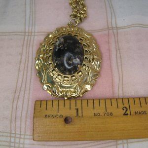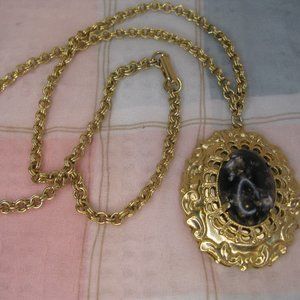 Black, white and gold faux stone cabochon set on gold tone pendant with 21" long chain, unknown maker, nice condition, very pretty piece.