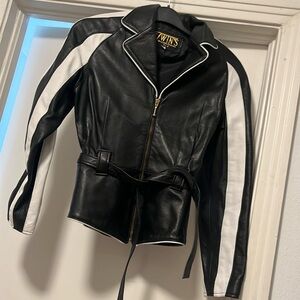 Vintage Black & White Leather jacket w/waist belt small