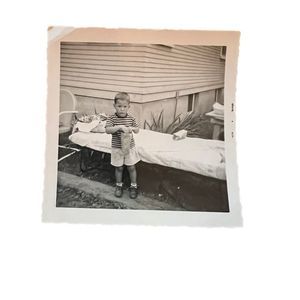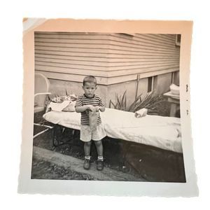 This boy is outside reaching into a brown paper bag. He appears to be standing in front of a cot? The face he is making is something else. Picture is in good condition considering age. There is some writing on the back and one corner is bent. Look at pictures for condition details.