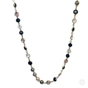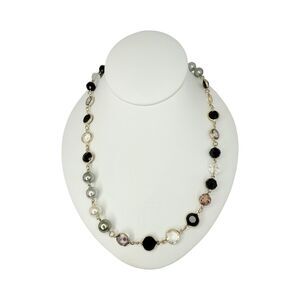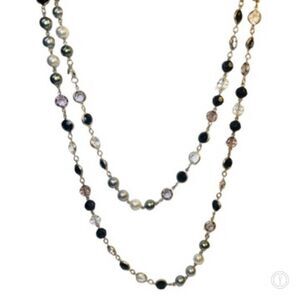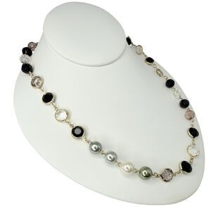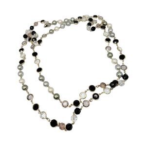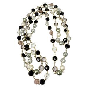 Vintage Black & White Rivoli Beaded Layering Necklace 60" Silver Tone