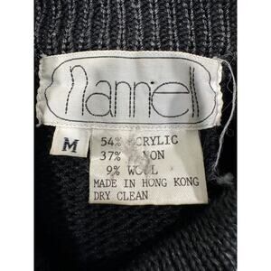 Turn heads in this striking vintage black wool-blend pullover, featuring a glam mix of shimmer and texture. The statement sequin design—reminiscent of animal and leaf motifs—cascades down one sleeve and side, catching the light with every move. Crafted with a cozy mid-weight knit and subtle mock neckline, this sweater pairs retro sophistication with party-ready flair. Perfect for evening outings, holiday gatherings, or adding a touch of sparkle to your everyday style.