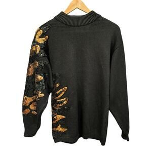 Keywords: vintage sequin sweater, black glam top, retro sparkle knit, wool blend pullover, 80s party sweater, animal leaf sequin, mock neck vintage knit, statement sleeve