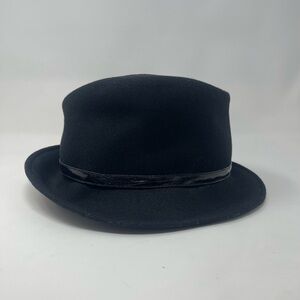 Vintage black wool fedora hat featuring a classic wide brim silhouette.