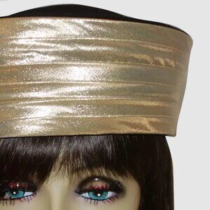 This is a gorgeous 100% black wool felt hat from the sixties. It features a 3 1/4" tall brim covered in gold lame`. It has a domed top and a black bow in back. The interior is stamped with the wool logo and reads "100% Wool Felt Hat Made in USA". It is in excellent condition and measures 22" around the inside.