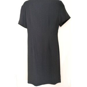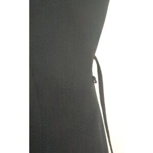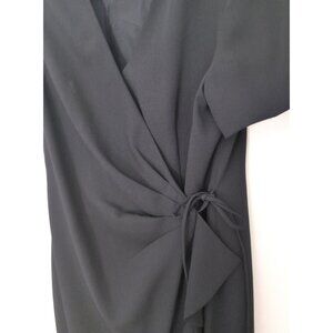 Black wrap style dress with short sleeves. Polyester texture fabric. The outer hook is kind of scuffed, see pics. The inner button is OK but probably also on thin ice.